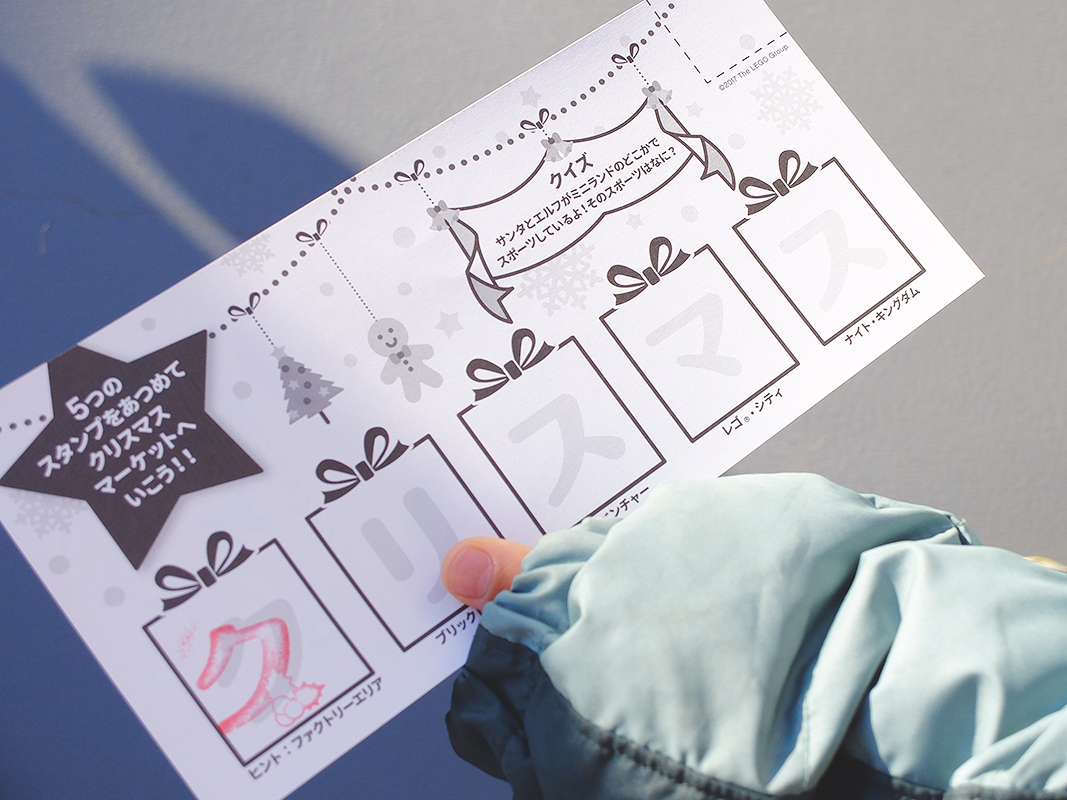 各エリアにいる帽子にブロックが付いたレゴレナ(スタッフ)さんに合言葉を伝えてスタンプを集めよう。5文字全部集めると輪投げゲーム「クリスマス・キッズ・クォーツ」にチャレンジできます!